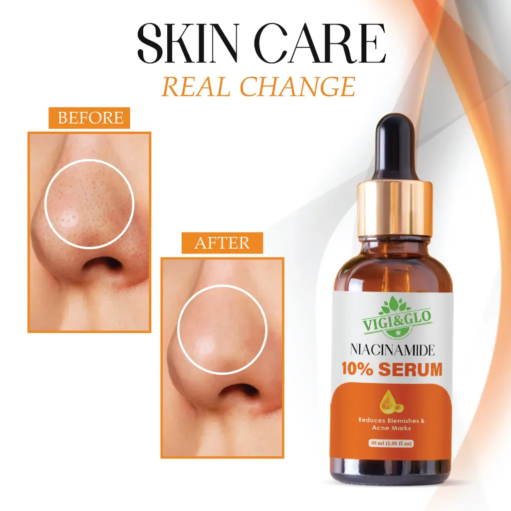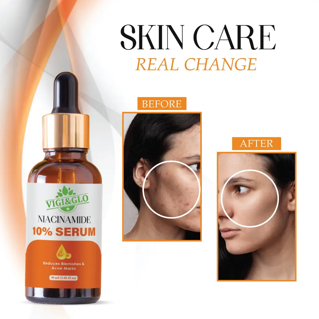 VIGI & GLO Niacinamide 10% Face Serum (30ml) is a high-performance solution designed to target acne marks, blemishes, excess oil, and uneven skin texture—common concerns for Indian skin. Formulated with 10% Niacinamide, it helps regulate sebum production, refine pores, and improve skin resilience.