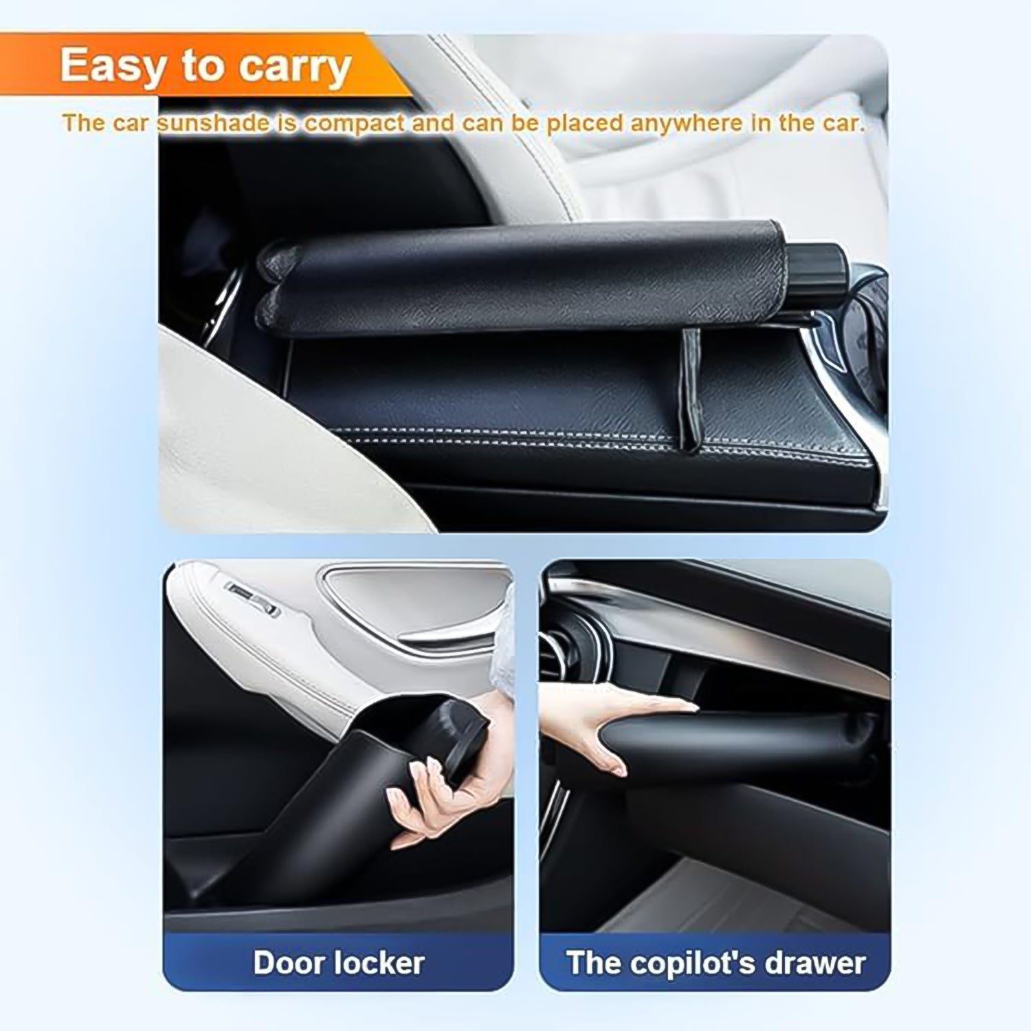 - Just like an umbrella, our sunshade is easy to install and fold, which can be done in seconds.You can store it to the glove box, door panel or under the seat without taking up extra space.