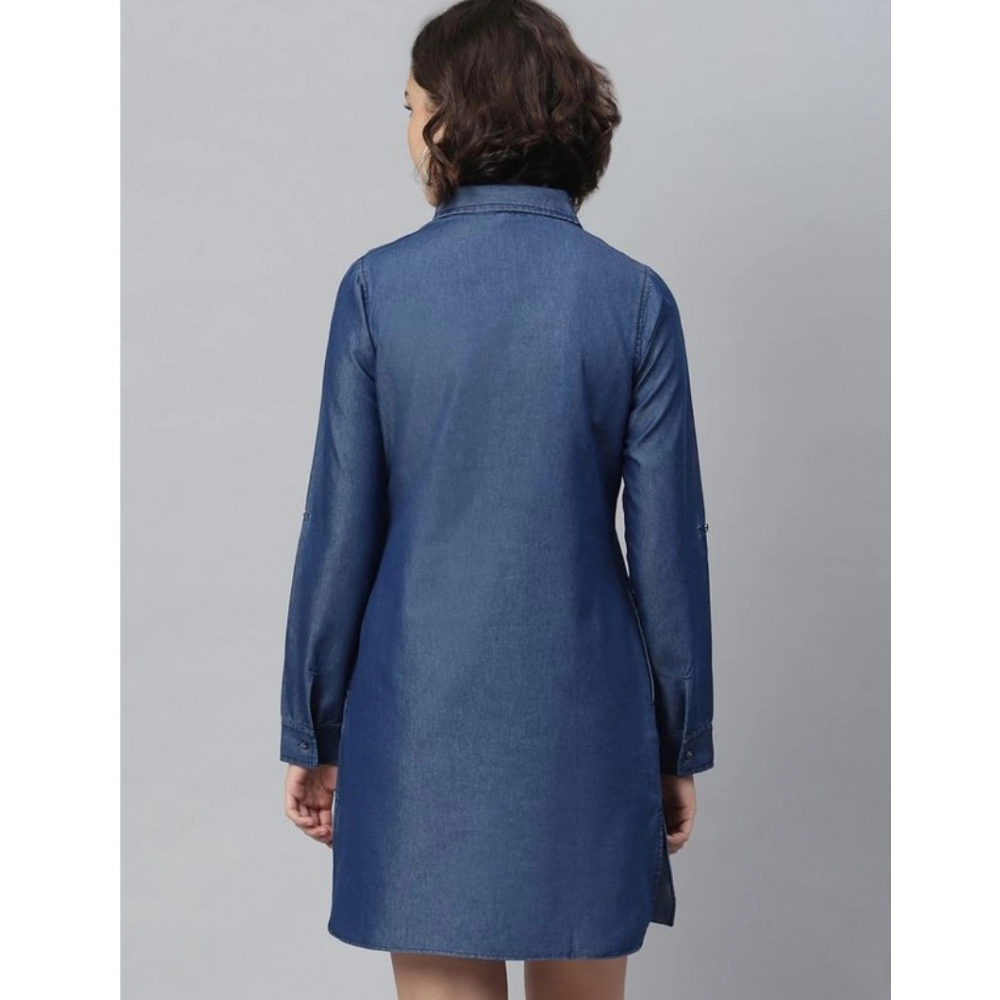 Elegant Women’s Denim Solid Long Sleeve Above Knee Dress – Navy Blue
